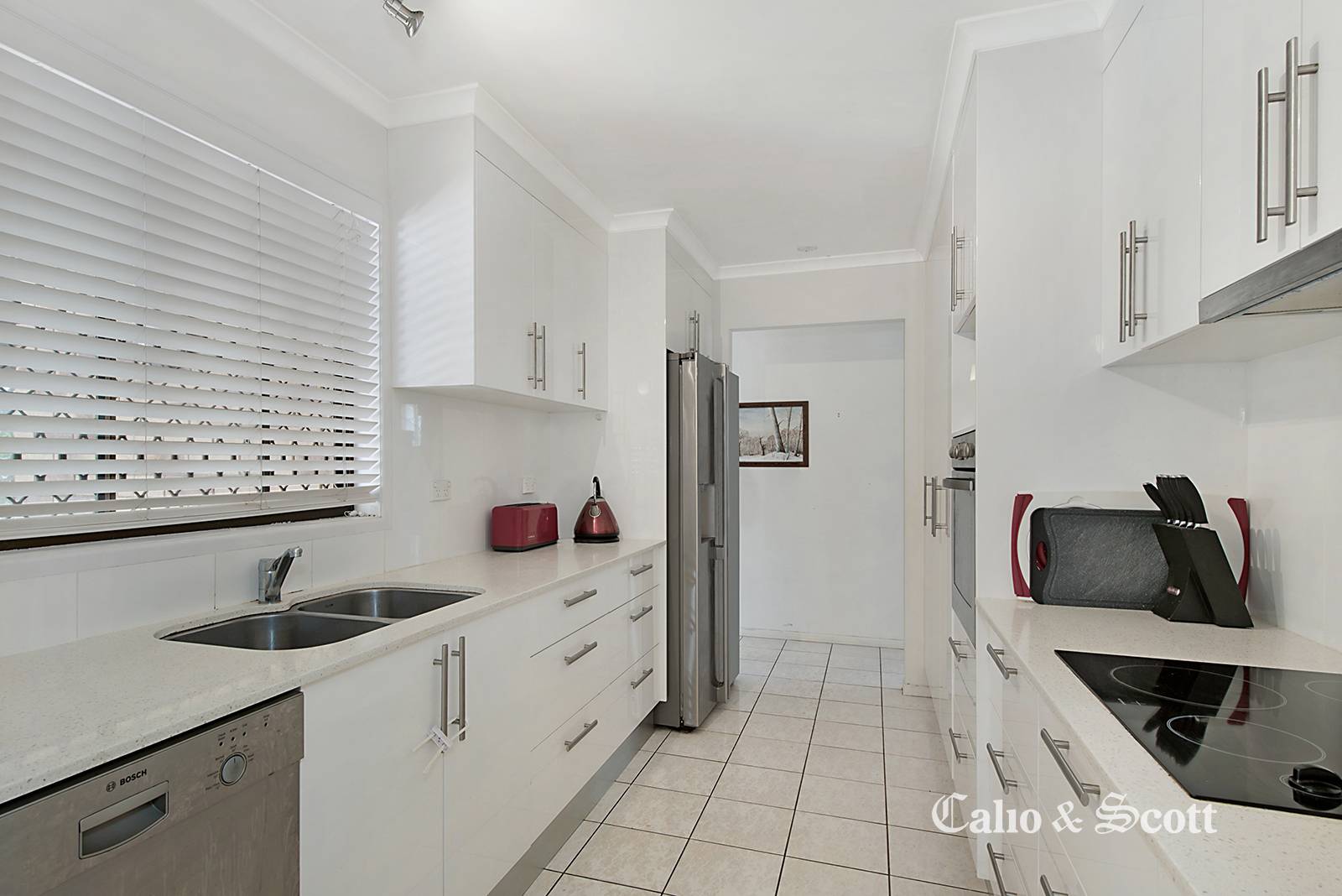 The impressive modern kitchen includes stainless steel appliances, Caesarstone bench tops and ample cupboard space.