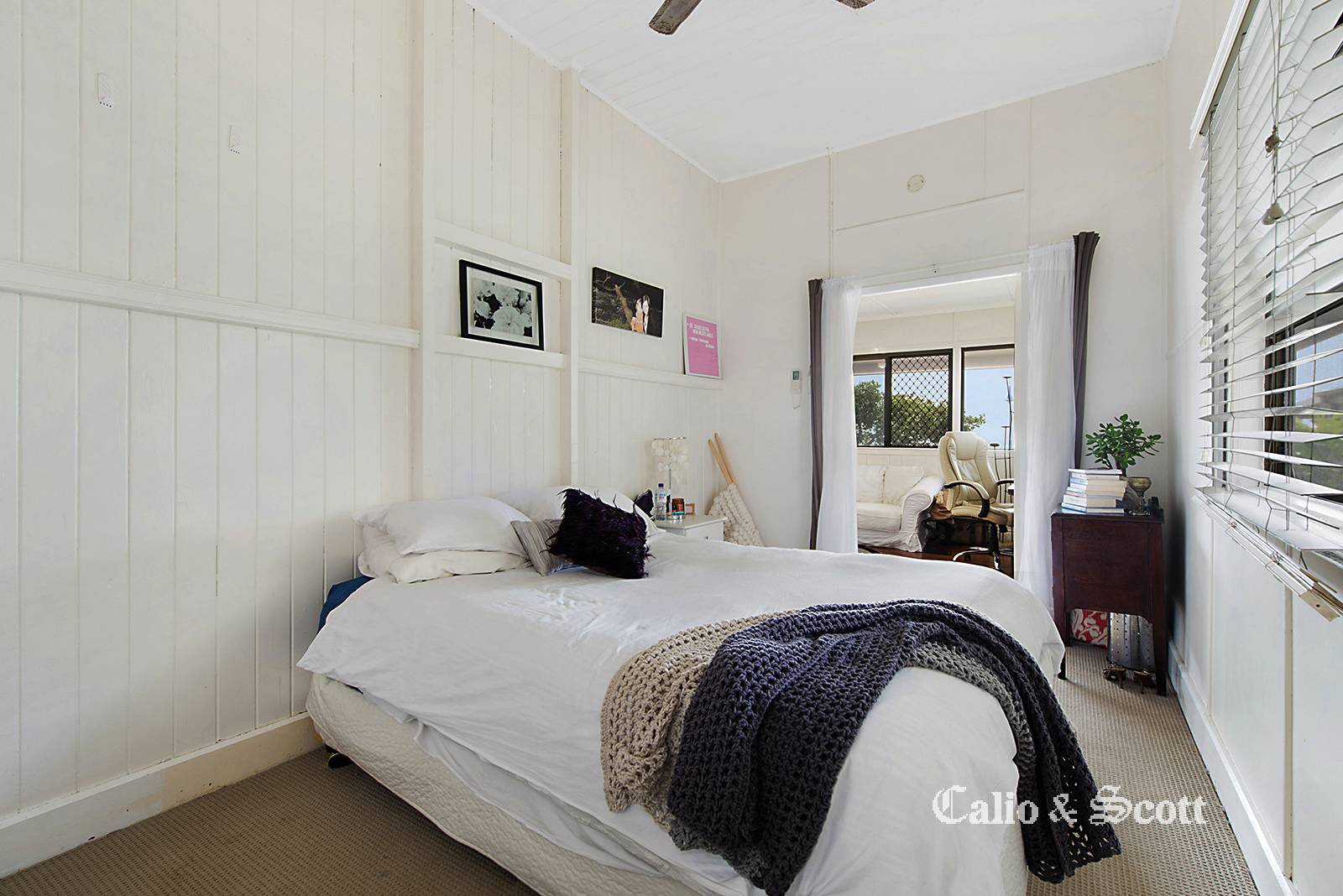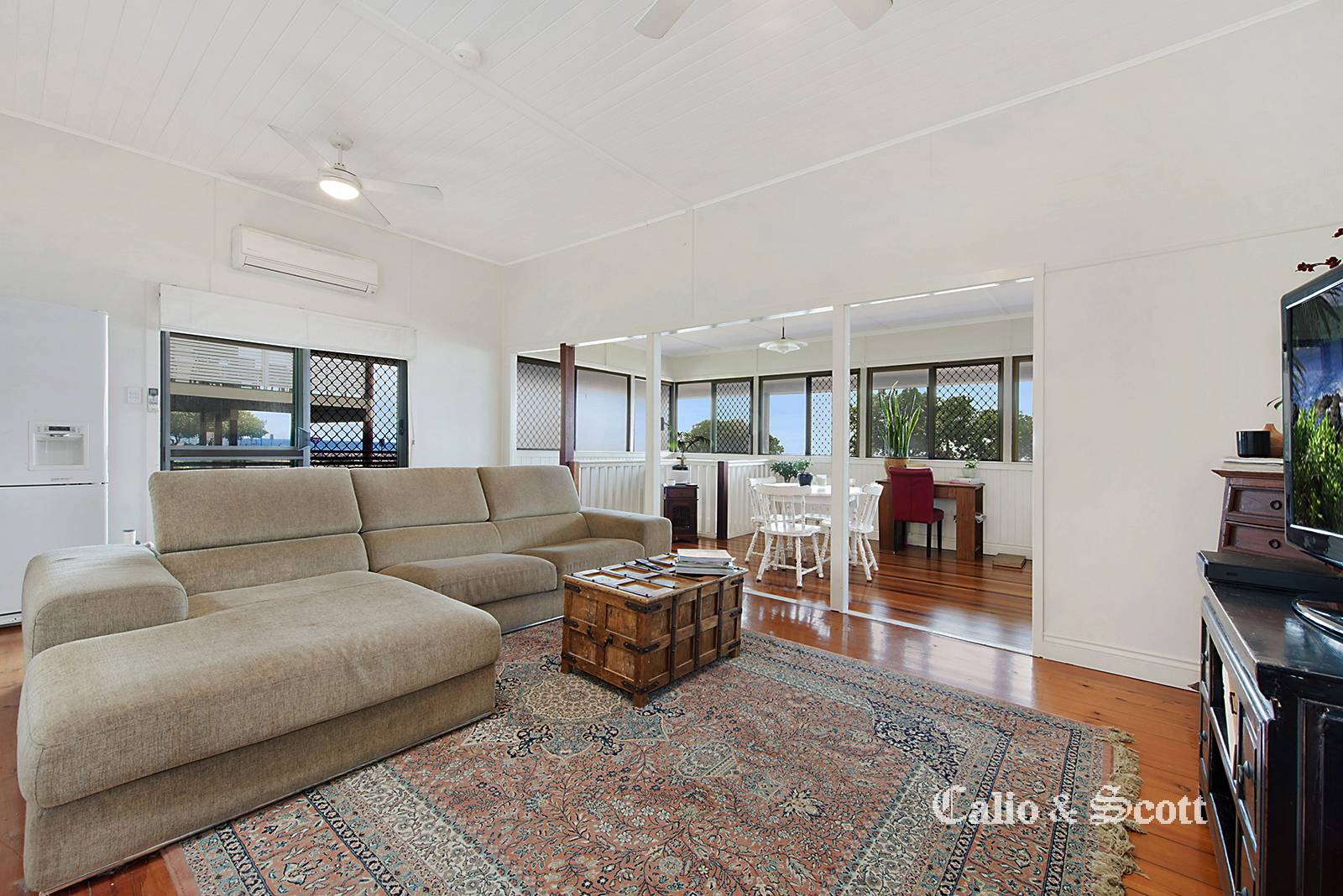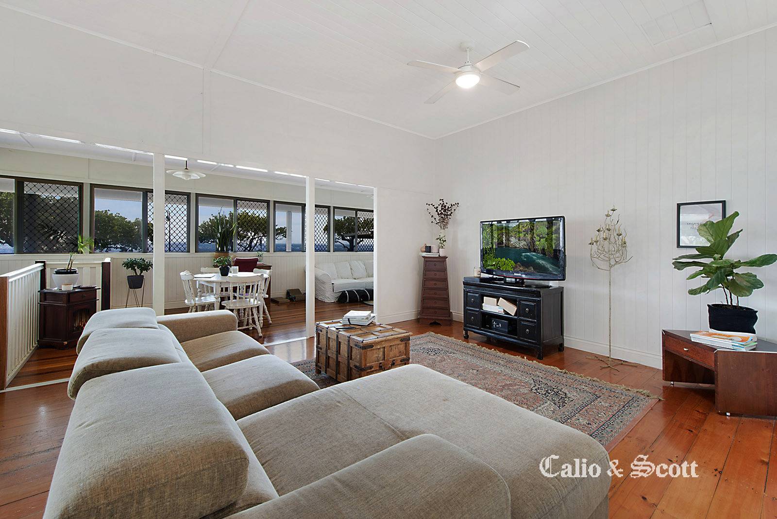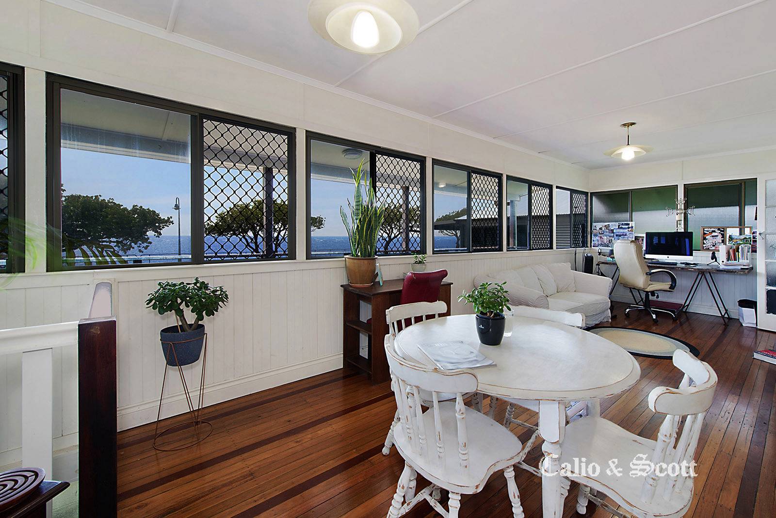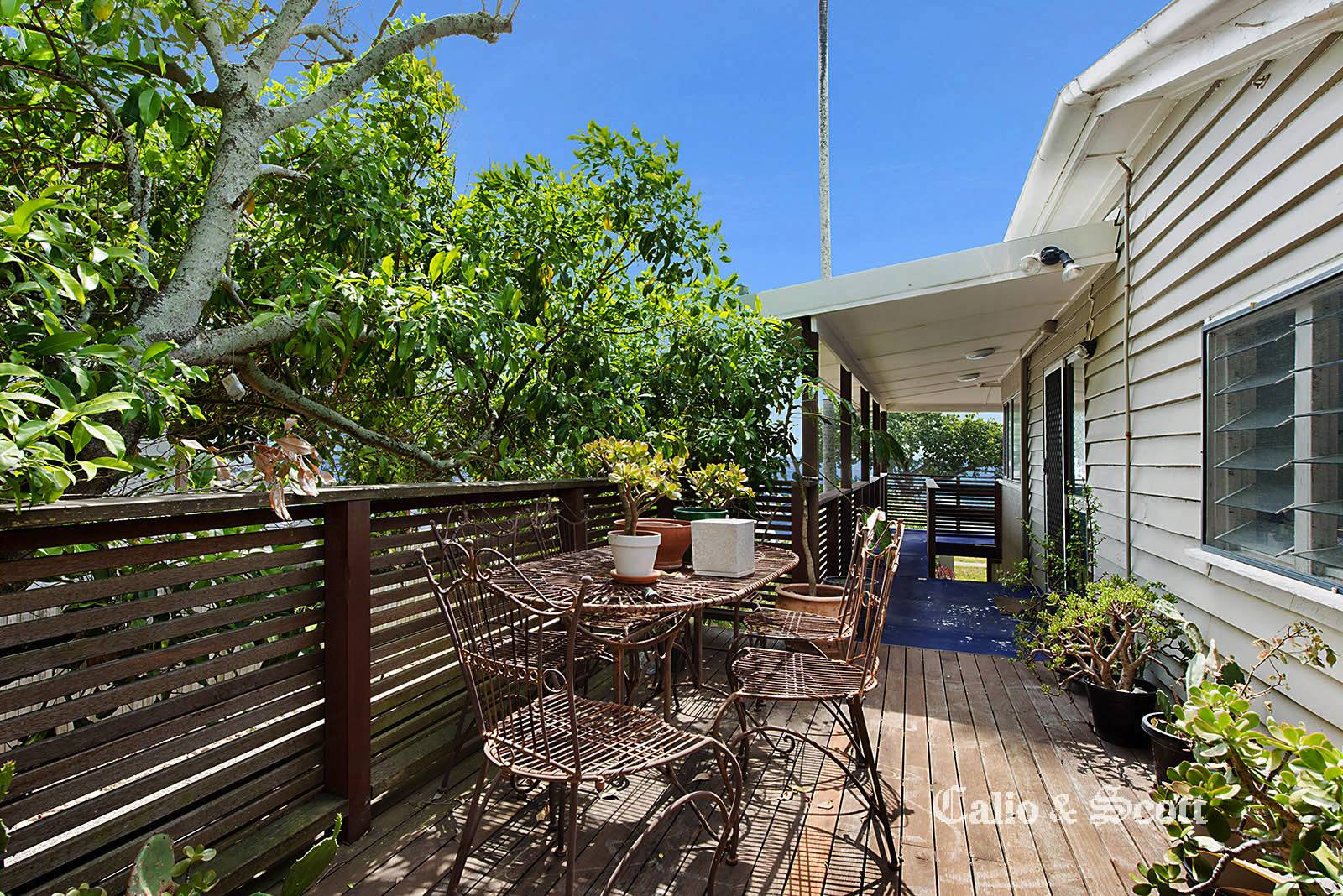 This original beach style home has had a few improvements over the years that were completed specific to the needs of the home owner of the time.  The property now has a light and bright combined living and dining area featuring VJ interior which incorporates the enclosed verandah.  There are windows across the entire front of the home which showcase the magnificent location and capture cooling breezes. The kitchen was modernised in the 90’s and again has windows all around to allow light and ventilation through the home.  There is a rear deck off the kitchen which runs along the side of the home to the front entry area and has been made attractive by the privacy planting and greenery which shade the right hand side of the home.  French doors from one bedroom open out onto the enclosed front verandah which means you can literally wake up to views over Bramble Bay.