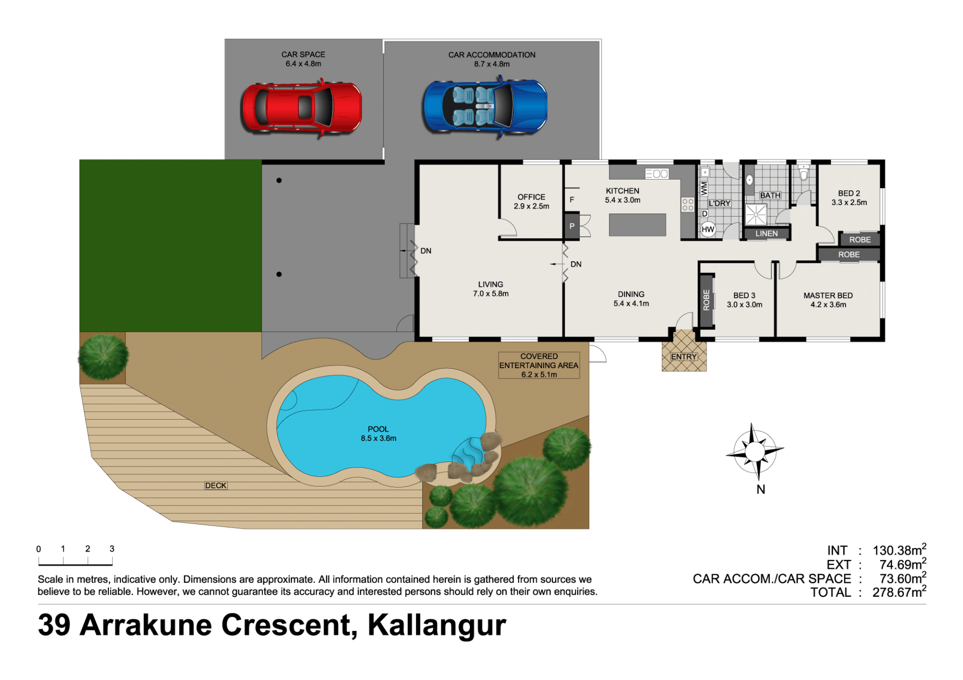 - Three bedrooms with built-in robes and carpeted floors, spacious main with air-con;