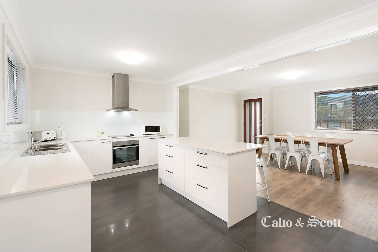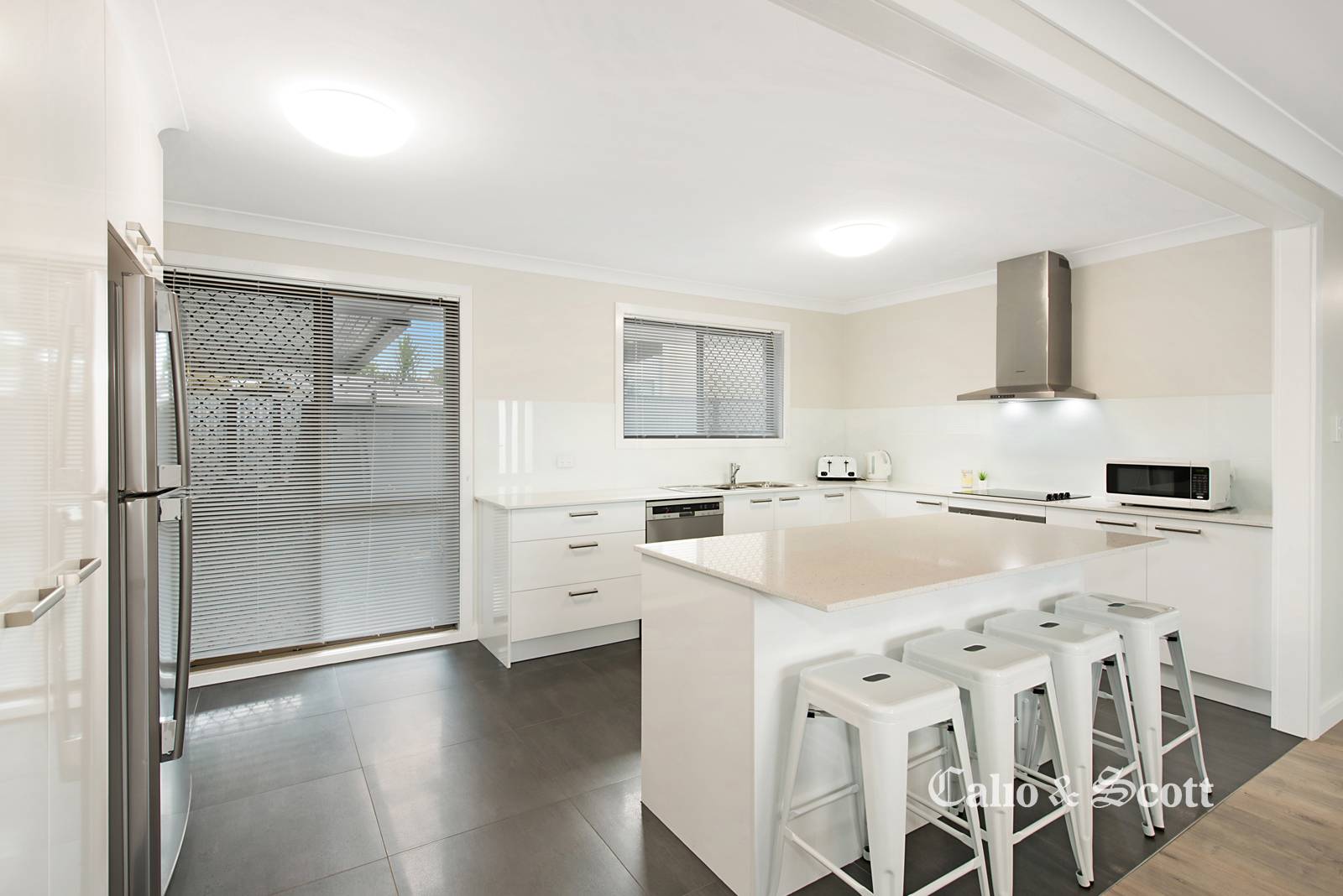 - Large  kitchen featuring stone benchtops, stainless steel appliances, ample storage, island bench, & breakfast bar, plus external access to the adjoining undercover patio area;