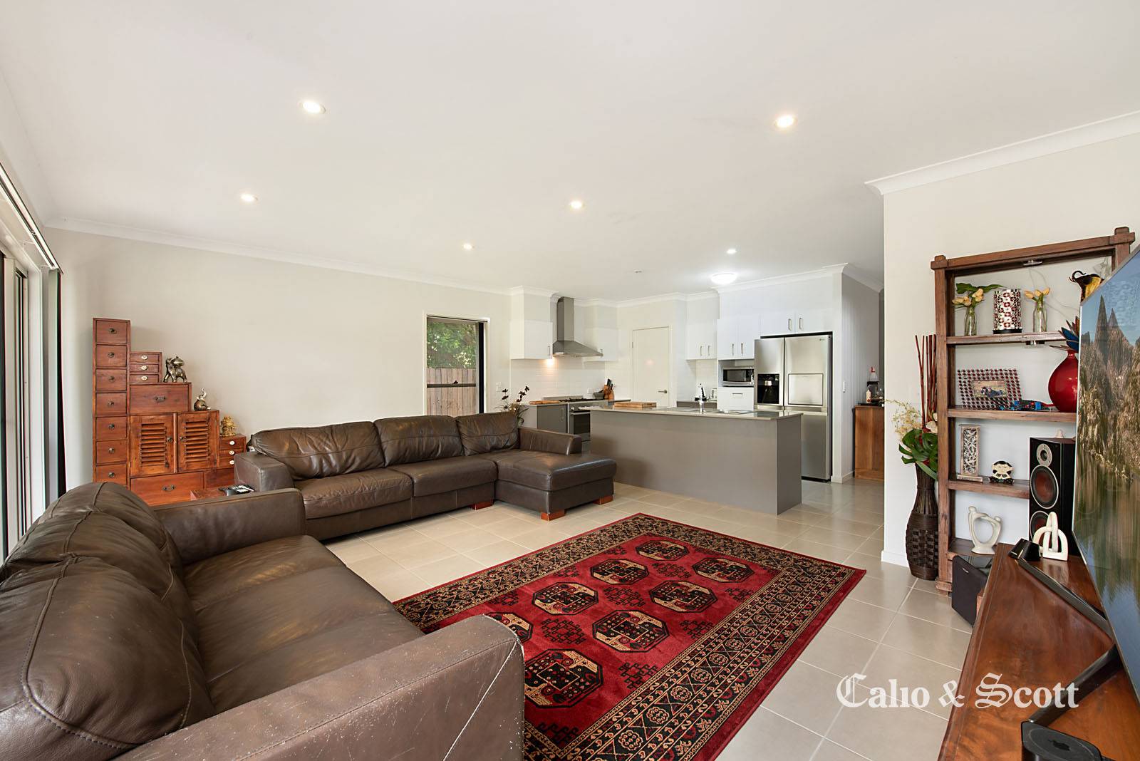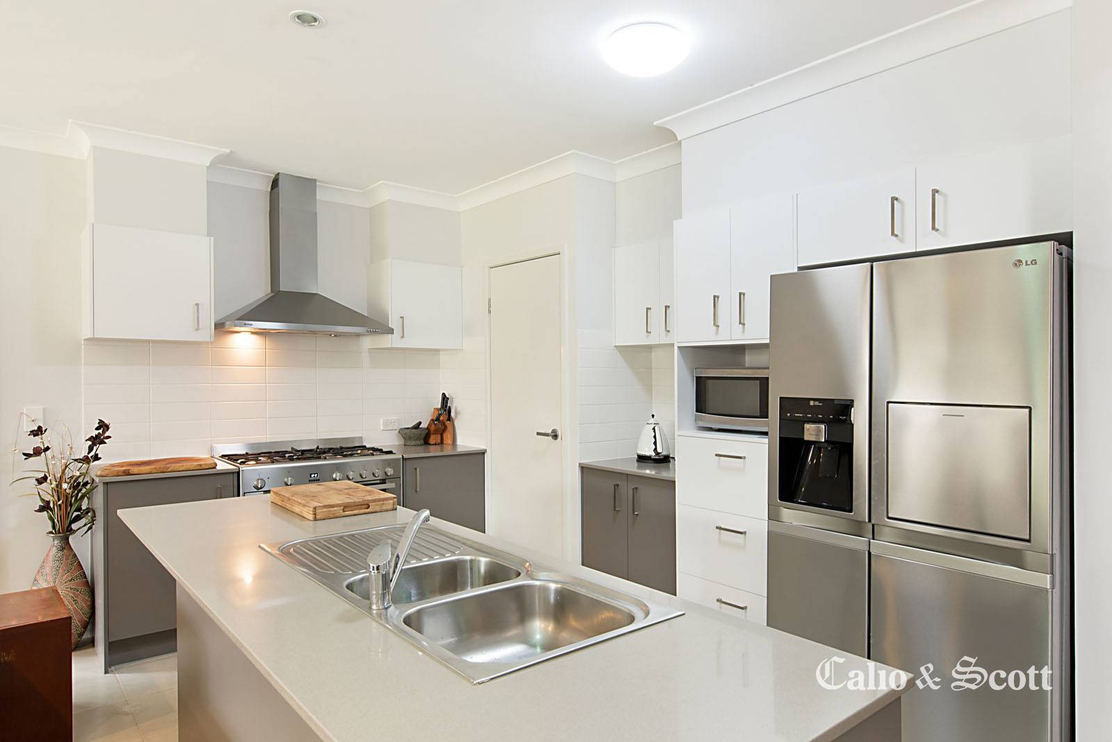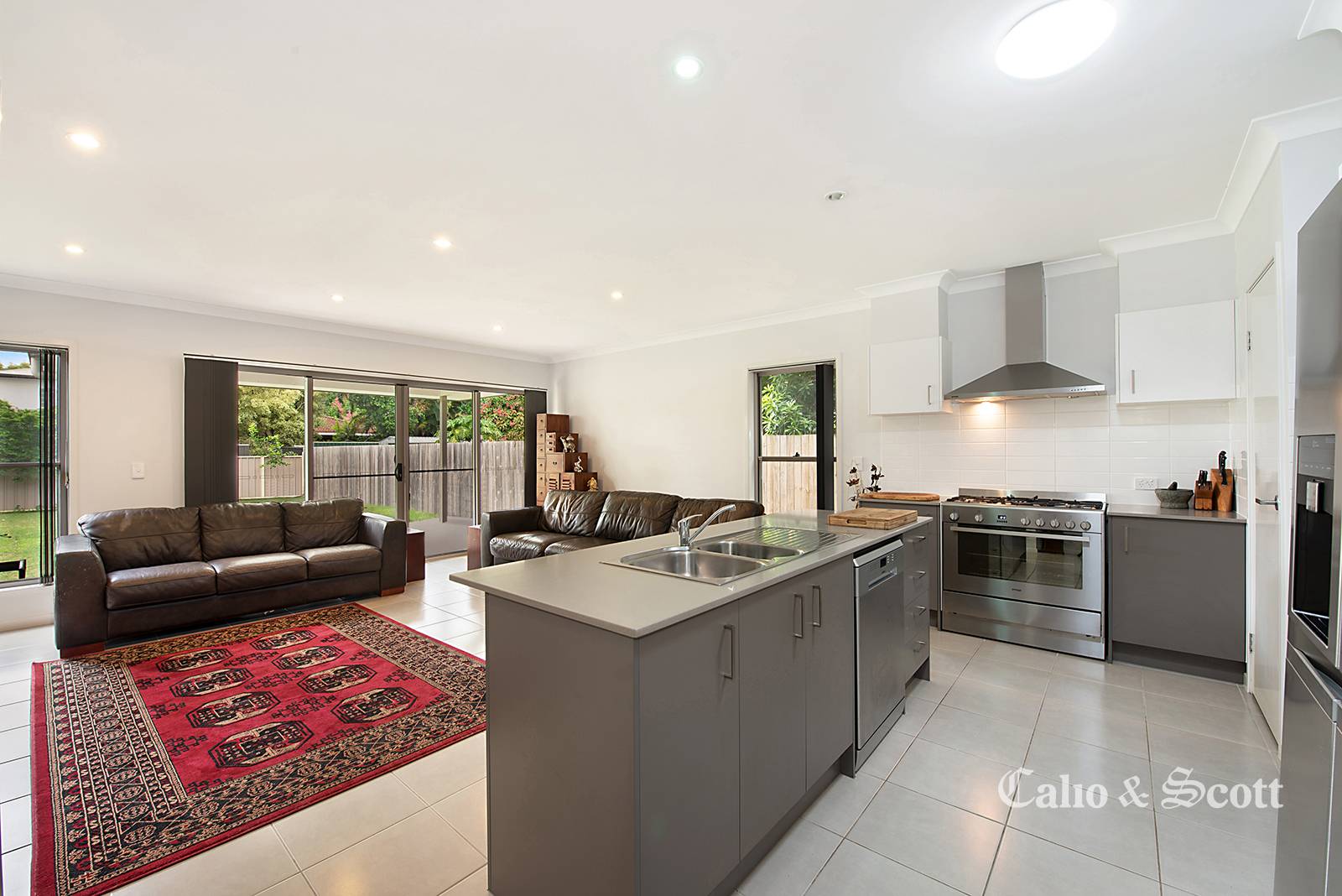 The open plan kitchen with breakfast bar and functional tiled splashback has kept integration in mind with double door fridge size space, five burner stainless-steel gas oven, stainless-steel dishwasher, microwave and coffee machine nook and walk-in pantry.