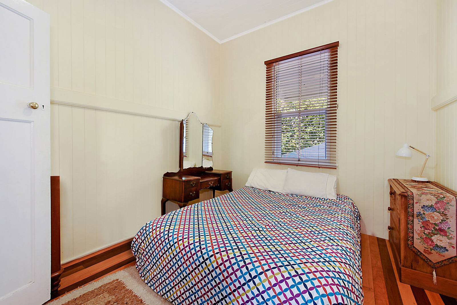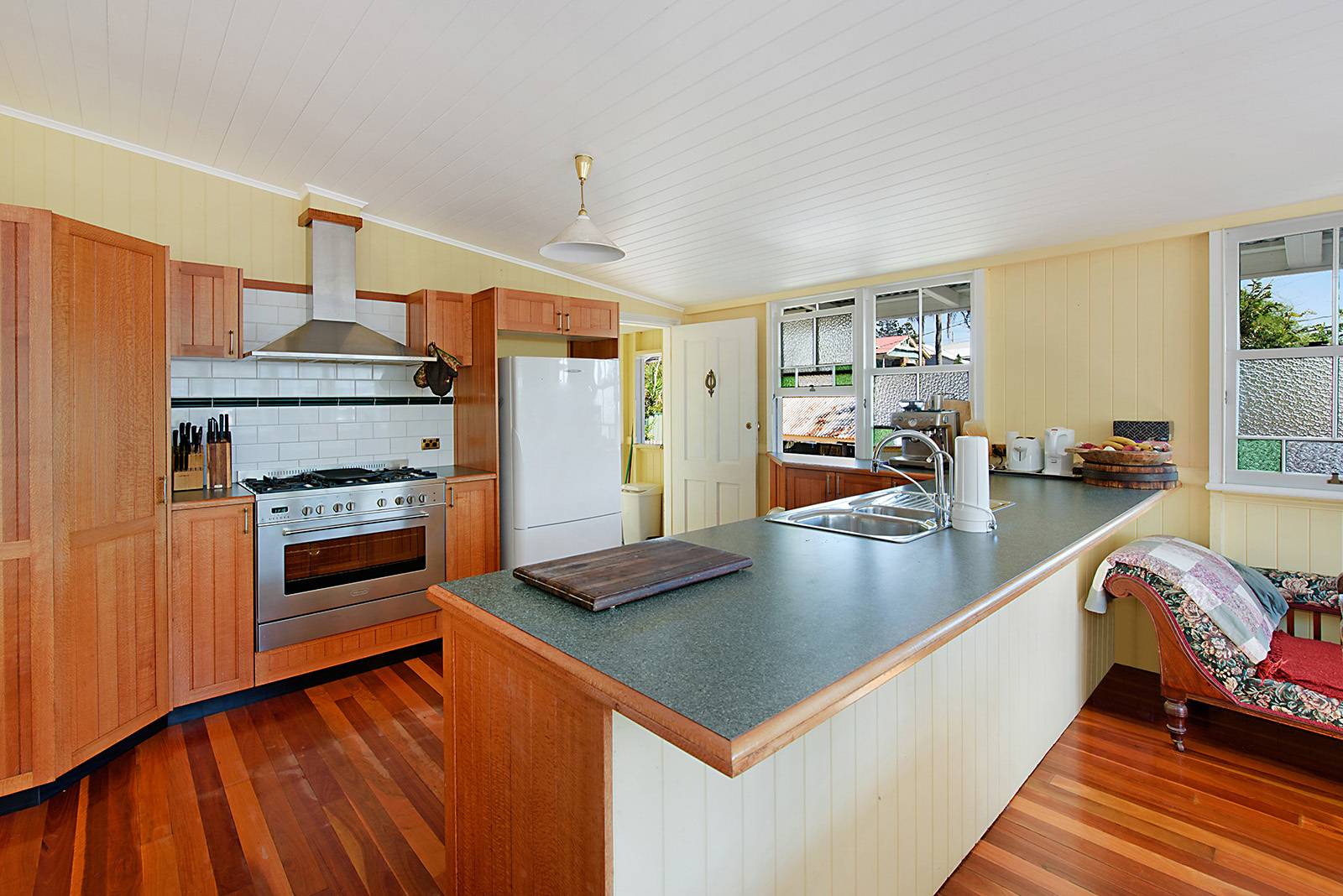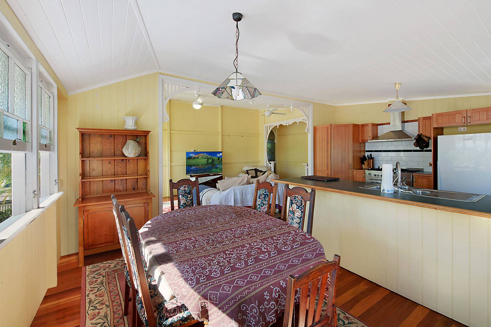 The home has been gently modified over time to accommodate the “must haves” of today which includes a generous open plan living, dining and kitchen area all surrounded by decorative coloured glass windows which not only allows light to filter in but also important cross ventilation and cooling breezes during our summer months. The Silky Oak kitchen with 5 burner gas stove has a fabulous oversized peninsula bench which is perfect for family gatherings and entertaining or simply enjoying breakfast or a chat over after school homework.