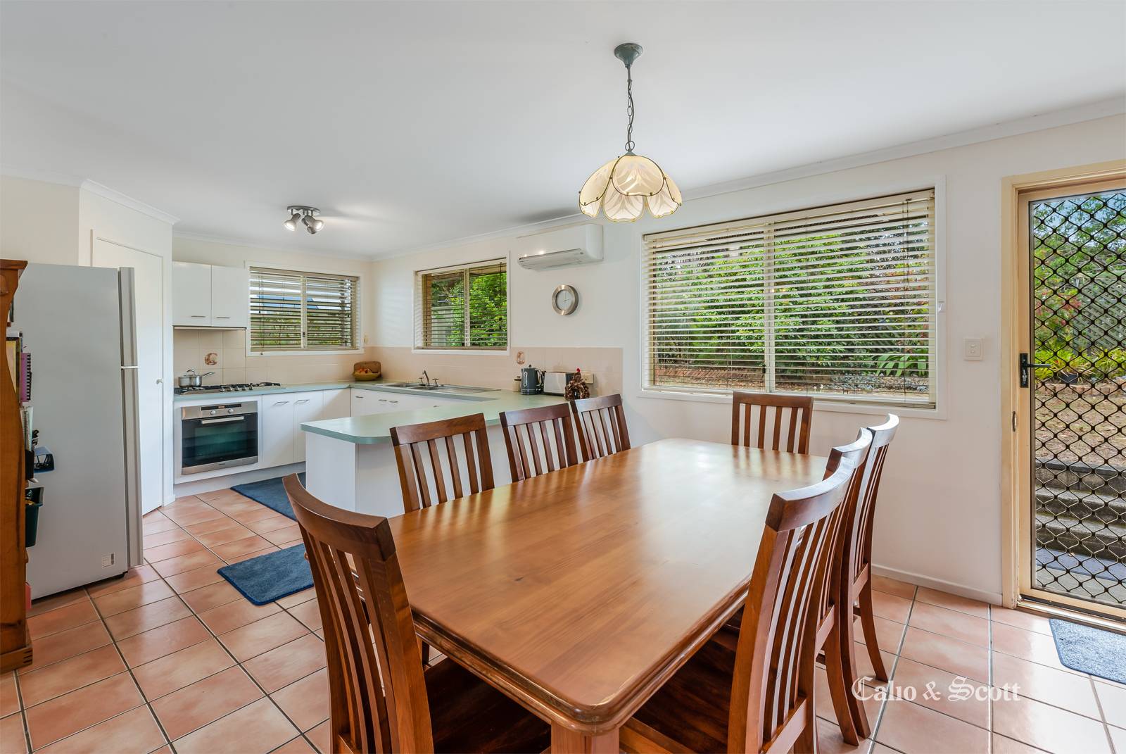 - Large kitchen space with adjoining dining area, neatly tiled for easy care;