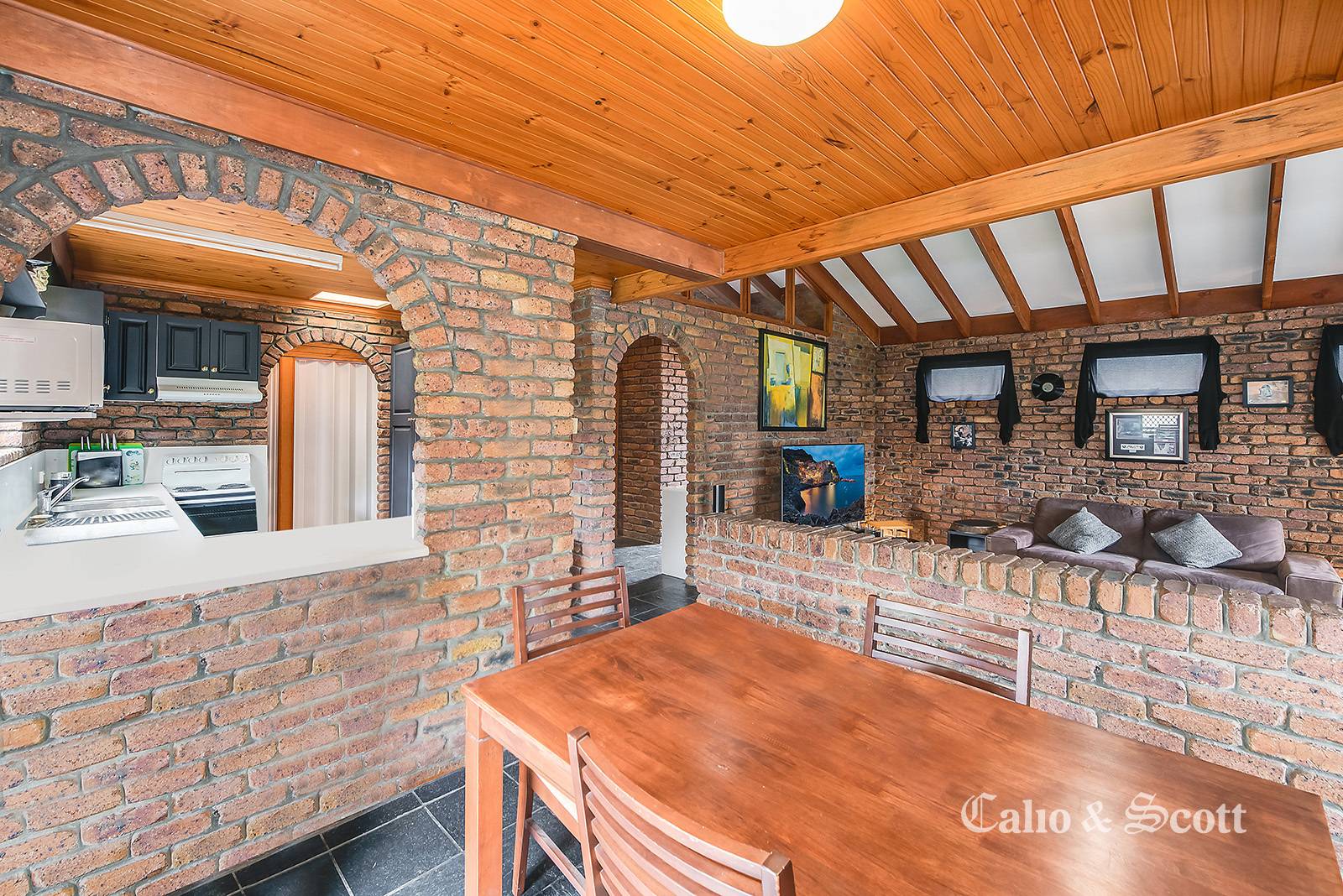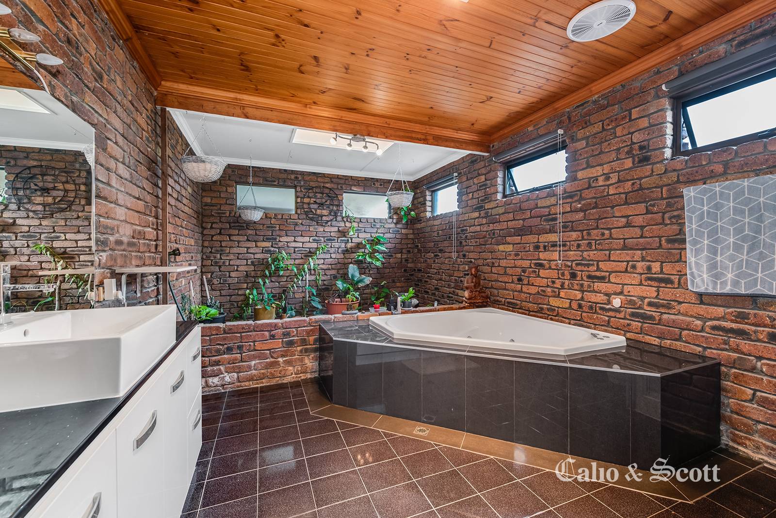 Behind the white picket fence is a lovely front porch area with privacy screening which captures our beautiful bay breezes and is a nice place to enjoy a book or chat with friends.  You enter the home from the side and are immediately presented with a fabulous 4m high raked ceiling and exposed brick interior, dining area which overlooks the sunken lounge with wide bright bay window.  The renovated kitchen has a pass through to the dining and plenty of cupboard and pantry space.  There are two bedrooms off the entry and main hallway with the master having a secret door to the studio suite (or third bedroom) which comes complete with its own separate access, kitchenette and bathroom.  A magnificent main bathroom with its own internal atrium space (fernery) & massive spa bath gives the feeling of opulence and over the top style.
