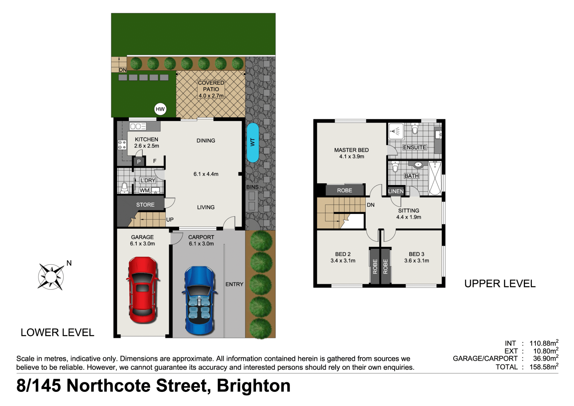 The lower level offers air-conditioned, tiled, open plan living and dining, as well as kitchen with stainless steel appliances. There is under stair storage, internal laundry and third toilet included as well. Summer dining/ relaxing is possible with an undercover patio area at the rear with courtyard space for gardens also.