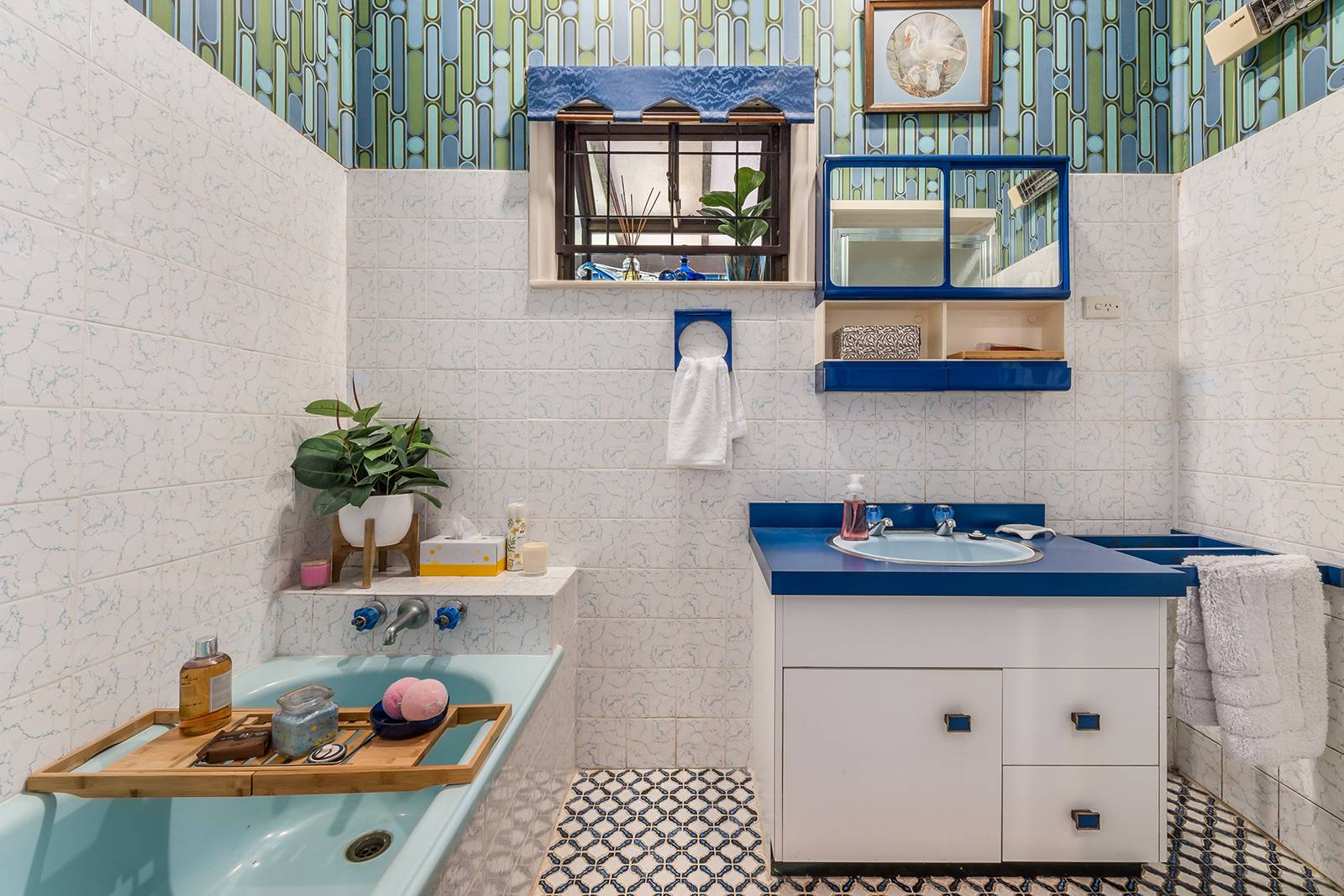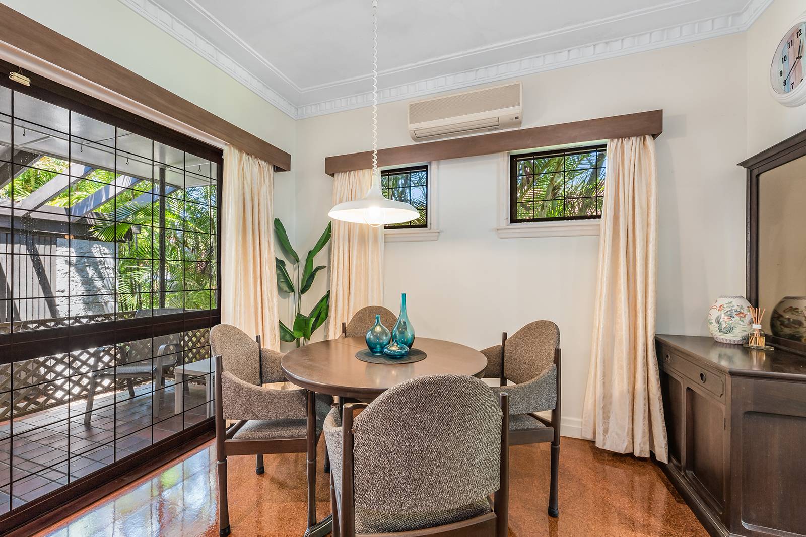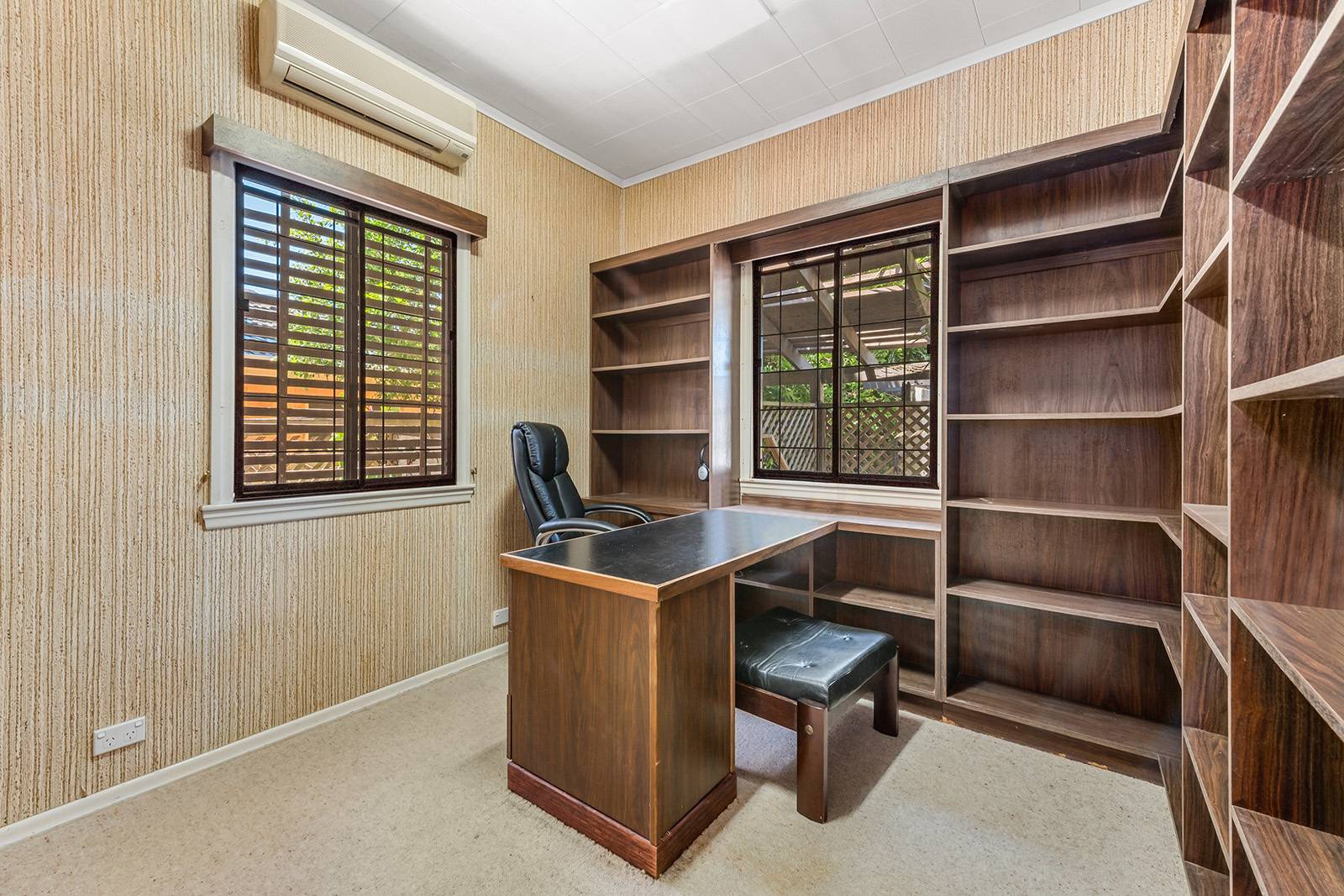 The home has a distinctive retro 70’s feel with its gleaming cork tiled floor which mirror and bounce light around the rooms.  The 2.7 metre high ceilings and ornate cornices featured in the main living and master bedroom are quality additions to an already stylish home.  The air-conditioned master bedroom has a walk-in robe and en-suite bathroom, the second bedroom is also air conditioned, with the third bedroom being currently used as a home office.  The family bathroom has a shower and large separate bath to soak in and relax at the end of the day or simply to clean the kids before bed.  Just between you and me, the retro bathroom floor tiles are gorgeous even by today’s standards and not one crack or blemish!