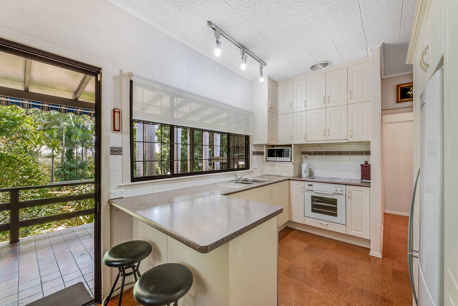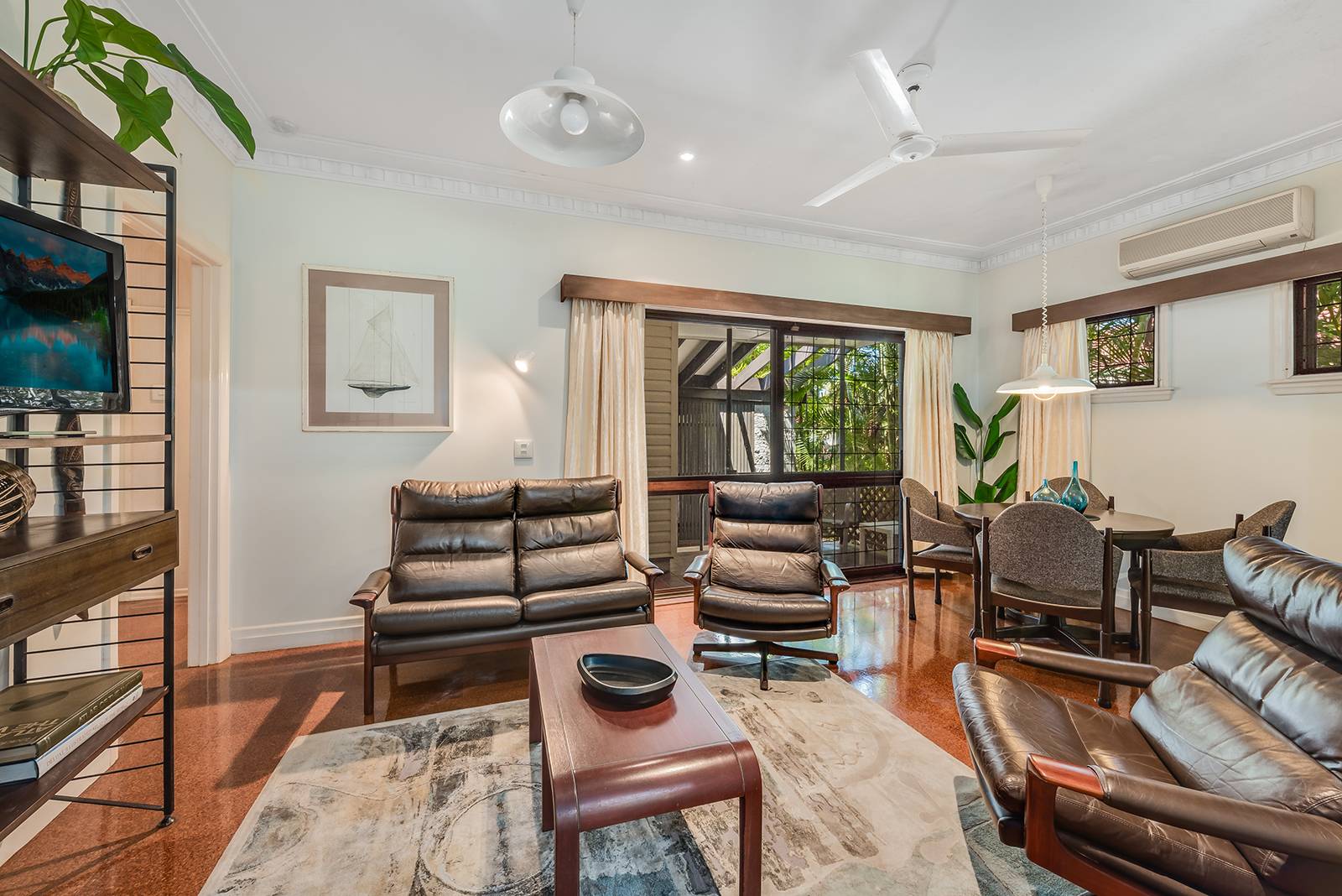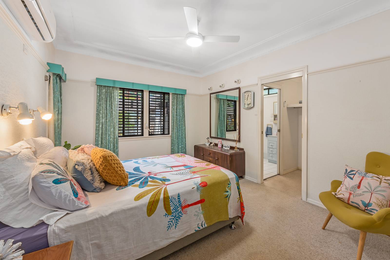 The home has a distinctive retro 70’s feel with its gleaming cork tiled floor which mirror and bounce light around the rooms.  The 2.7 metre high ceilings and ornate cornices featured in the main living and master bedroom are quality additions to an already stylish home.  The air-conditioned master bedroom has a walk-in robe and en-suite bathroom, the second bedroom is also air conditioned, with the third bedroom being currently used as a home office.  The family bathroom has a shower and large separate bath to soak in and relax at the end of the day or simply to clean the kids before bed.  Just between you and me, the retro bathroom floor tiles are gorgeous even by today’s standards and not one crack or blemish!