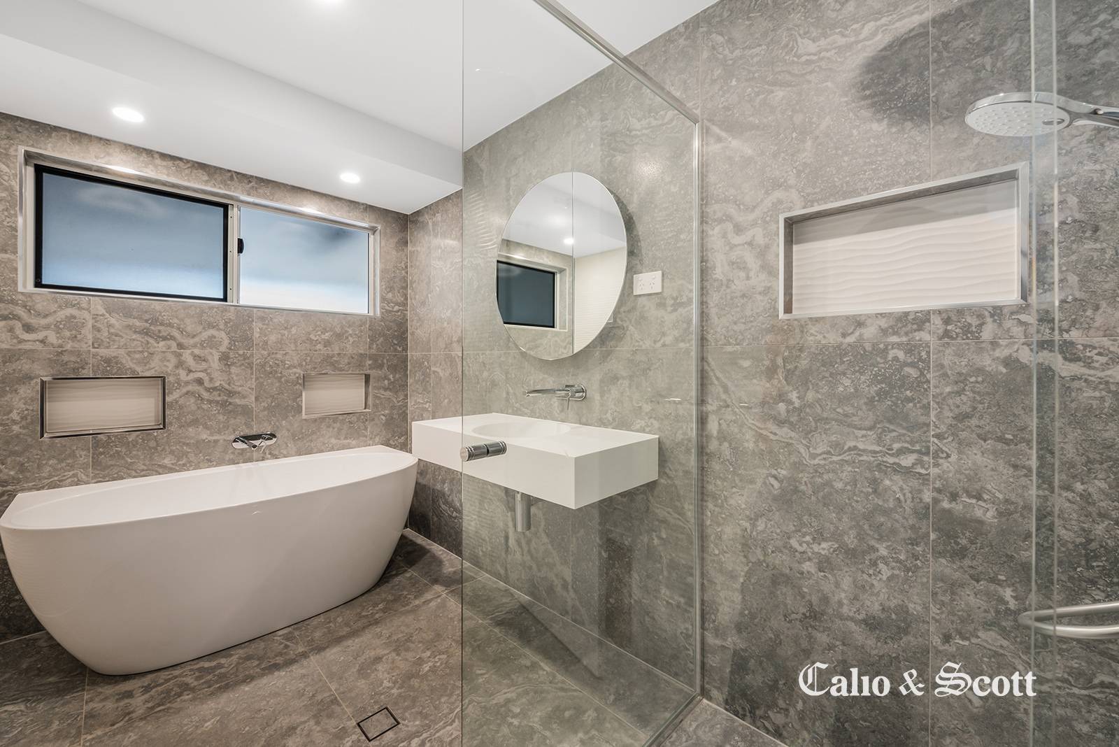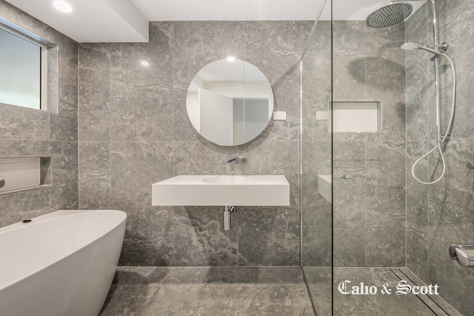 - Main bathroom with floor to ceiling tiles, separate bath and shower;