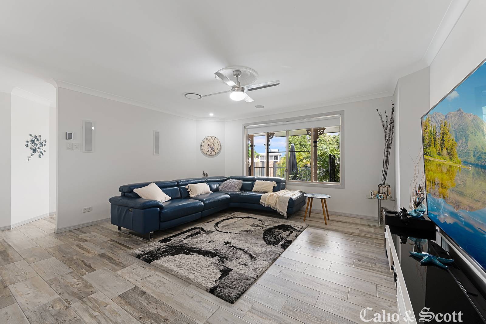 The delightful open plan living with magnificent modern kitchen enjoys a massive central island bench with integrated lighting, Caesarstone surfaces and large walk-in pantry. Bosch appliances feature including both a built-in compact oven with microwave function plus separate pyrolytic oven with gas cooktop and stainless-steel dishwasher.