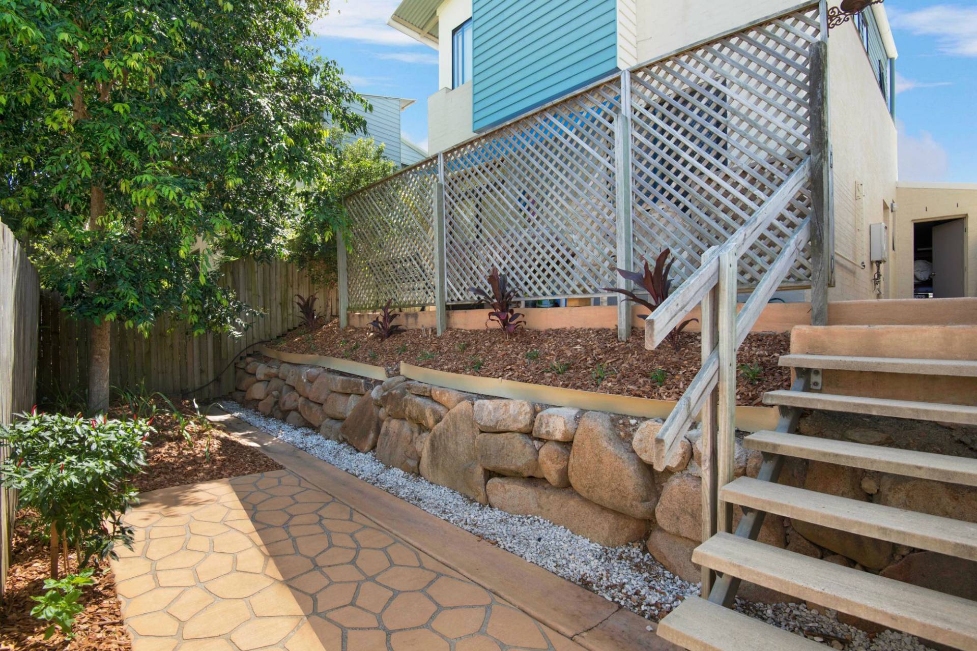 Internal access from the remote garage, a paved covered front patio and tiered rear landscaped gardens round out this superb opportunity to live by the sea.