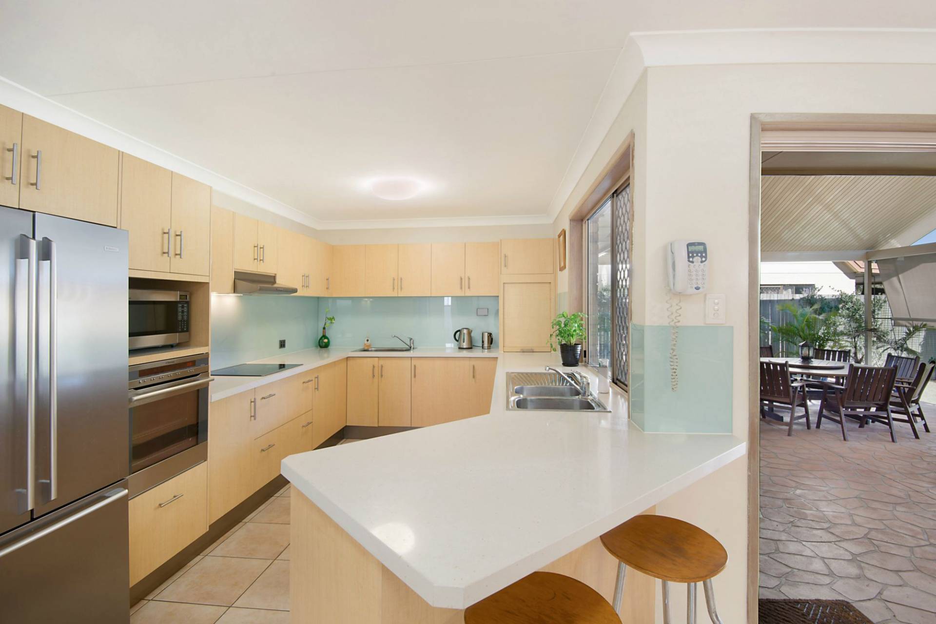 The renovated kitchen is to be admired with plenty of room and storage as well as good sight lines onto the covered entertainment area and pool.