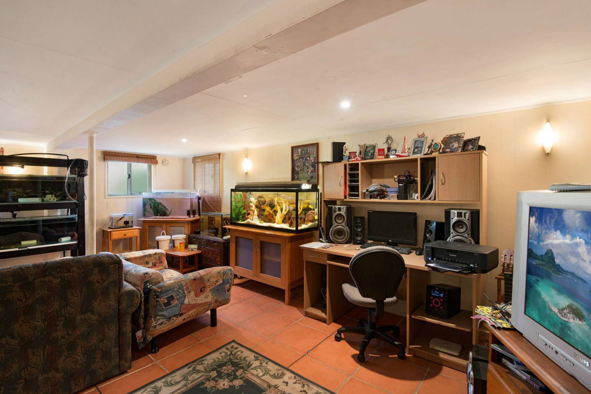 Downstairs has a large tiled rumpus with garage, laundry, extra w.c. and a rear covered pergola.