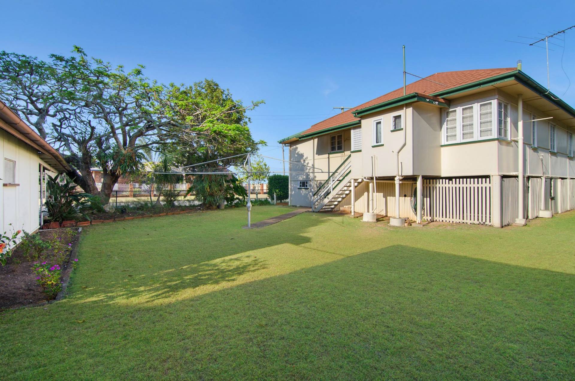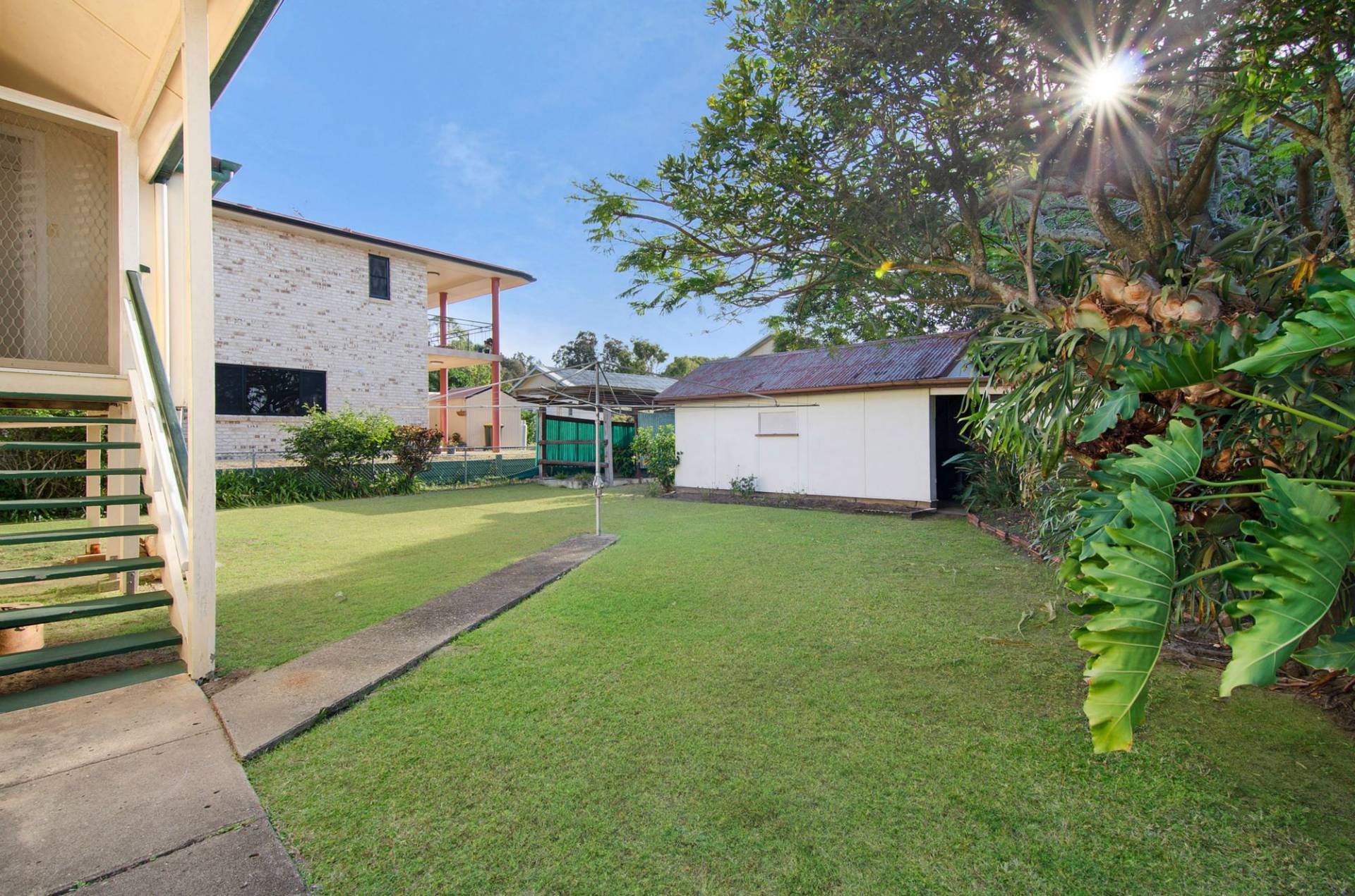 Downstairs is concreted with laundry and store rooms and there is rear driveway access to a separate garage and carport.