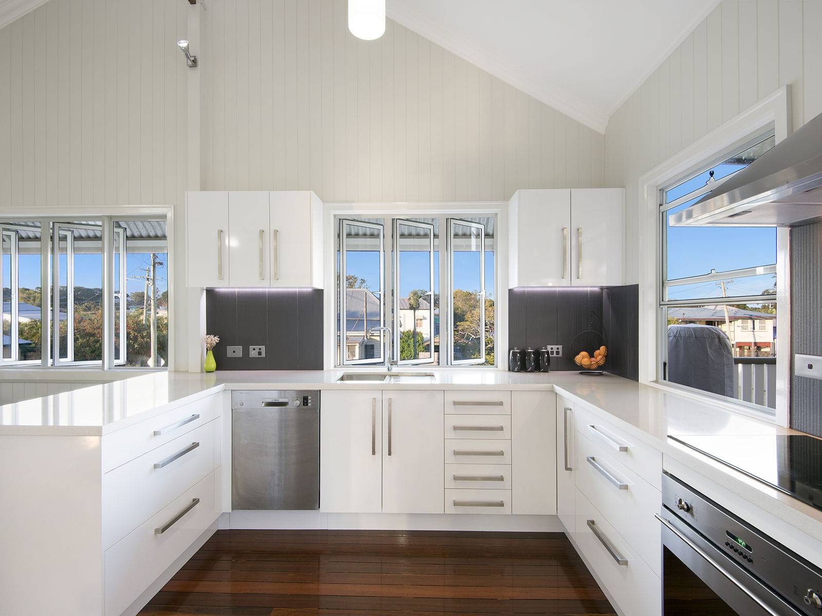 The kitchen includes a list of impressive features, such as 40mm stone, gloss finished soft close capentry to doors and drawers, feature textured recessed tile splashback, and Bosch & Smeg appliances. Polished floors and VJ interior walls are great touches, as is the new weatherboard finish on the exterior.