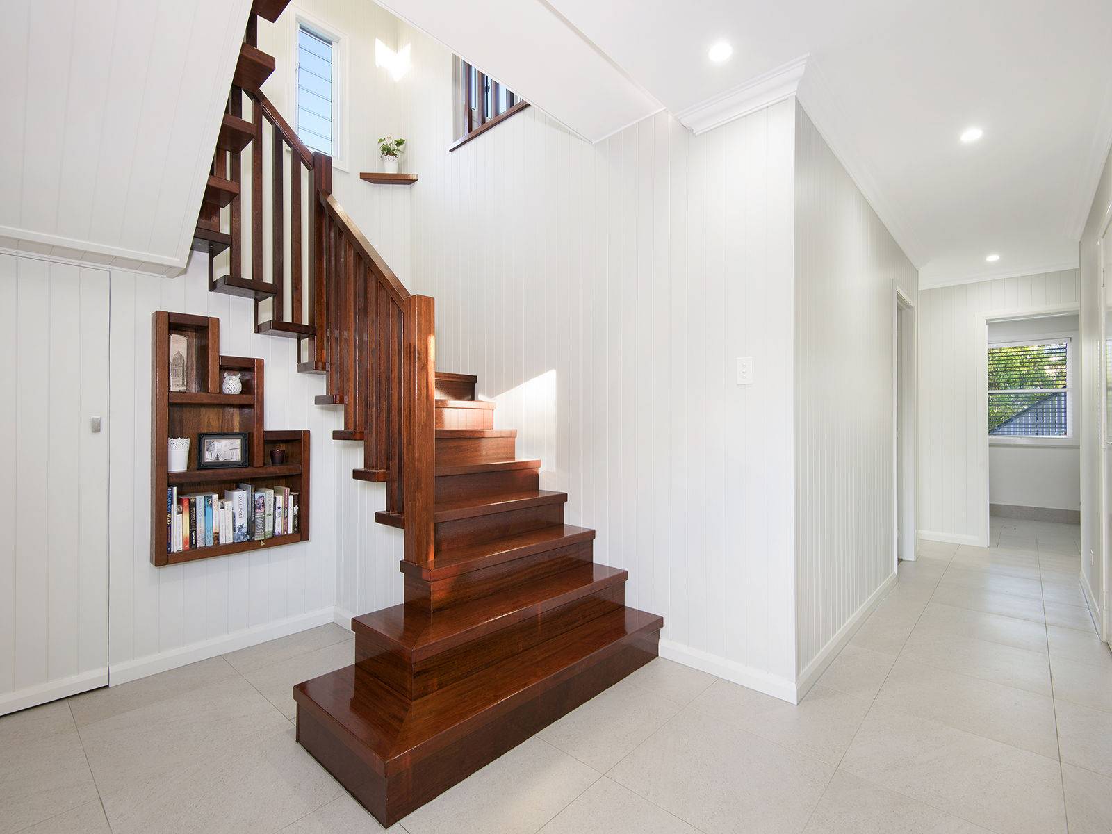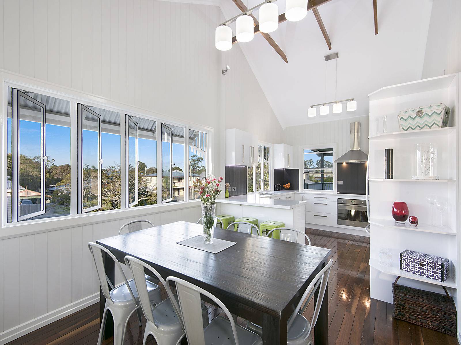 The semi-open plan for the kitchen, dining and lounge have a warm and welcoming feel with the featured raked ceilings and exposed rafters over the kitchen/dining area impressive and allow ample natural light from the northern skies. This is complimented by polished timber hardwood floors as a continuation of the featured timber staircase.