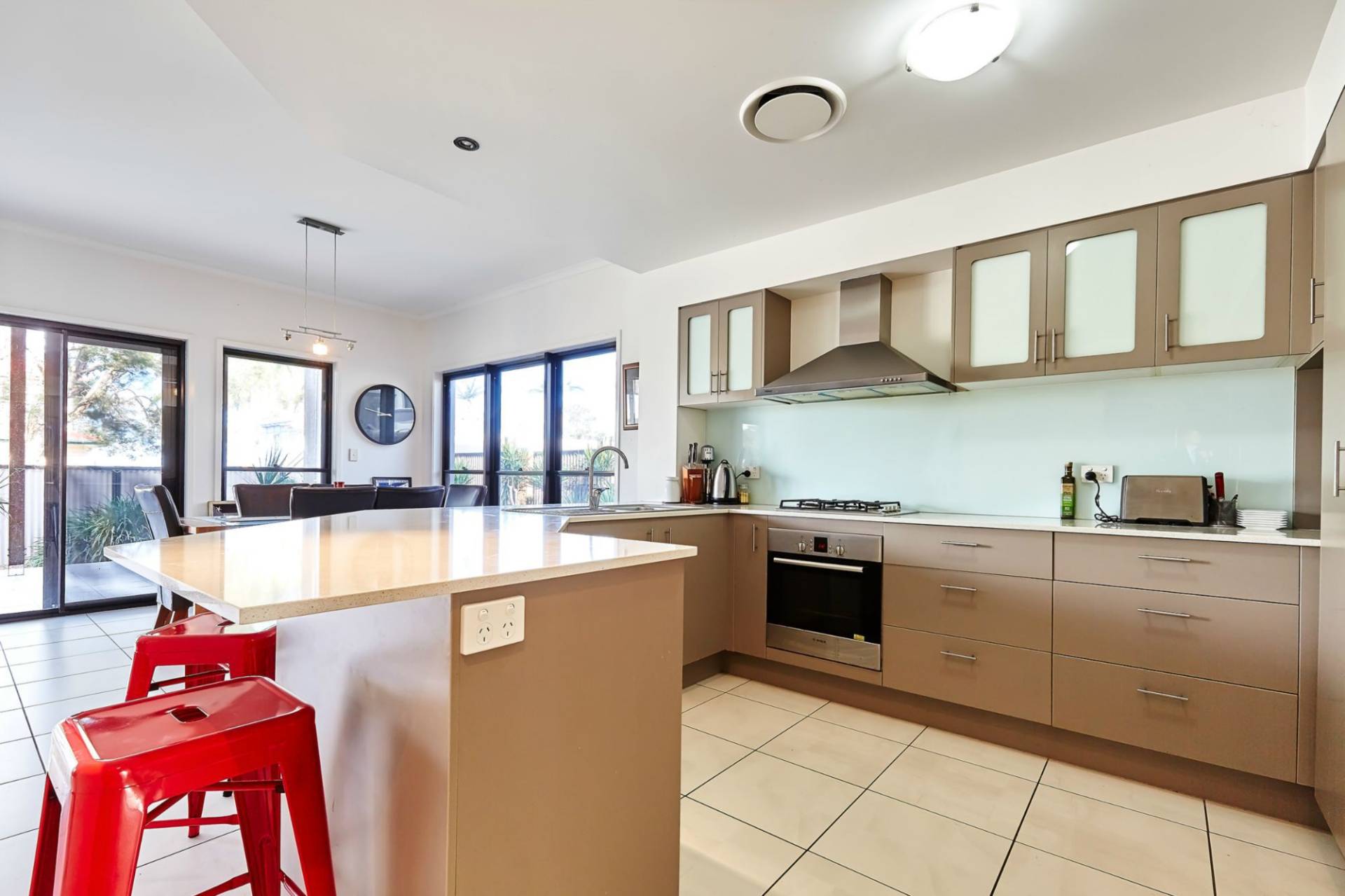 The open plan kitchen with beautiful stone bench tops and breakfast bar captures eastern water views.